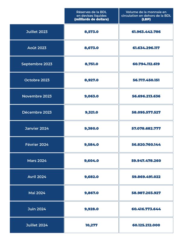 Les dernières statistiques de la BDL montrent que le volume de la monnaie en circulation en dehors de la BDL a diminué à 60.000 milliards de LBP fin juin 2024, soit l’équivalent de 675 millions de dollars, ce qui représente environ 7% des réserves liquides en devises de la BDL, au taux de change de 89.500 LBP par dollar.