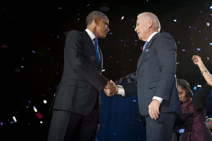 Barack Obama serre la main de Joe Biden le 6 novembre 2012. (Photo : Christopher Dilts)Un rôle qu’il occupera durant les deux mandats de Barack Obama. Biden devient son conseiller clé, son homme de confiance, son ami. L’ex-président loue chez lui des qualités d’empathie et de battants malgré sa réputation de gaffeur en série. Une personnalité qui le rend authentique aux yeux d’Obama. En février 2015, il perd son fils Beau atteint d’un cancer du cerveau et annonce cinq mois plus tard sa décision de ne pas concourir pour la prochaine présidentielle. La candidate démocrate Hillary Clinton perdra contre celui qui deviendra son principal adversaire politique, Donald Trump.