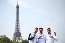Anne-Christine POUJOULAT / AFPLe médaillé d'or britannique Alex Yee le médaillé d'argent néo-zélandais Hayden Wilde et le médaillé de bronze français Léo Bergère posent après la cérémonie de victoire pour le triathlon individuel masculin.