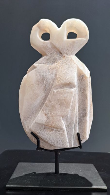 Les petites sculptures se présentent comme des écrins de bijoux. Ainsi en est-il de «l’idole aux yeux», sculpture en albâtre millénaire, à l’origine une offrande sur laquelle l’artiste a taillé deux portraits.
