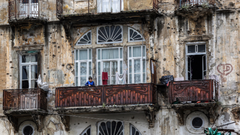 Un garçon se tient debout sur le balcon d’un immeuble ravagé par la guerre civile libanaise situé dans le quartier de Ras al-Nabeh. La guerre civile a éclaté le 13 avril 1975 et a pris fin en 1990 avec la signature des accords de Taëf.M. Messarra explique que le manque de consensus autour de l’Histoire du Liban moderne – mal enseignée dans les écoles – perpétue le cycle de la guerre. «Sans conscience de l’Histoire, les Libanais continueront de se faire la guerre chaque décennie», clarifie-t-il.