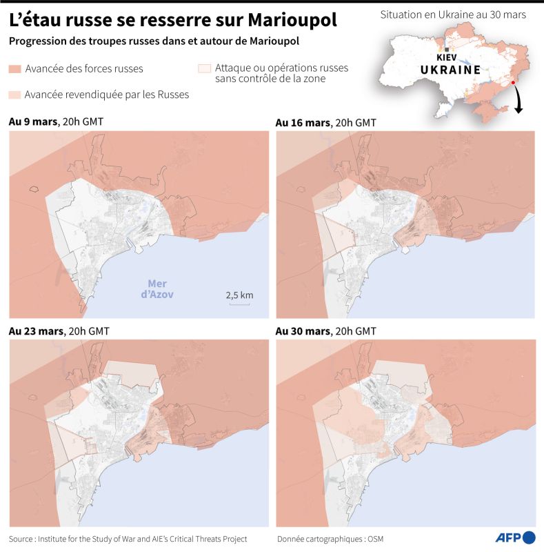 Viktoria Doubovytskiï se trouvait à l'intérieur du théâtre, sans toit, les débris et les blessés partout. Maria Koutniakova, elle, a tout vu depuis dehors, alors que sa mère et sa sœur étaient restées dans le bâtiment. Ces deux habitantes de la ville assiégée de Marioupol, aujourd'hui réfugiées à Lviv (ouest), racontent à l'AFP les minutes avant et après la frappe le 16 mars, que Kiev a attribué à la Russie. Depuis des semaines, la situation humanitaire est catastrophique dans cette ville de 450.000 habitants, où 160.000 personnes seraient toujours pris au piège, souffrant du manque de nourriture et du froid.Pour éviter la faim, le froid et surtout les bombardements, Viktoria s'était réfugiée dans le théâtre dramatique le 5 mars, pensant qu'elle y trouverait ensuite une place dans un convoi d'évacuation pour sa fille de deux ans, Anastassia, et son fils de 6 ans, Artiom.