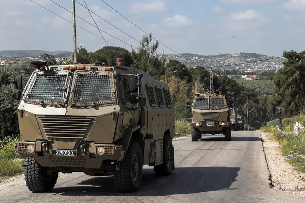 Des véhicules militaires israéliens circulent lors d'affrontements entre Palestiniens et forces israéliennes dans le camp de réfugiés palestiniens de Jénine, en Cisjordanie occupée, le 9 avril 2022. (AFP)L'armée israélienne a mené samedi matin une opération dans le camp palestinien de Jénine, d'où est originaire l'auteur de l'attaque meurtrière jeudi à Tel-Aviv, donnant lieu à d'intenses échanges de tirs qui ont fait un mort et de nombreux blessés.