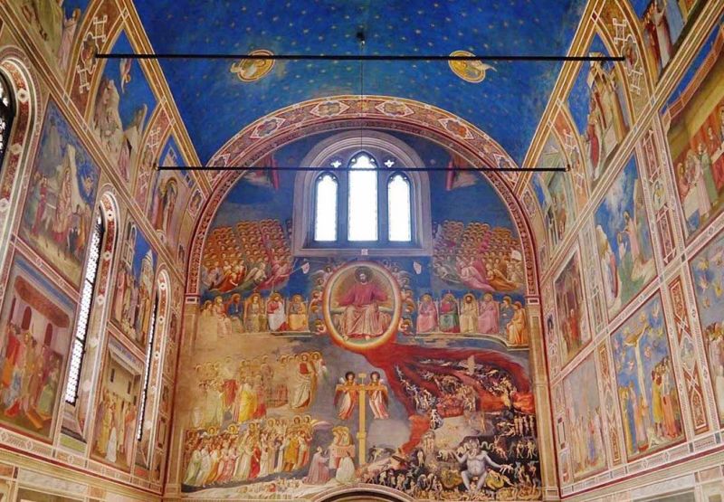 Dépouillée de l'extérieur, la chapelle renferme le cycle de fresques de Giotto. Ce chef-d’œuvre de la peinture aux couleurs intenses (le fameux bleu de Giotto) a été commandé au début du XIVe siècle par un riche mécène, Enrico Scrovegni, banquier et homme d'affaires padouan.