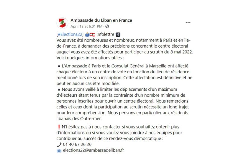 Le communiqué insiste sur le fait que « le ministère des Affaires étrangères, représenté par les missions libanaises à l'étranger, œuvre pour aider les électeurs à voter et les encourage à interagir avec ces missions pour assurer le succès et le bon déroulement du processus électoral».