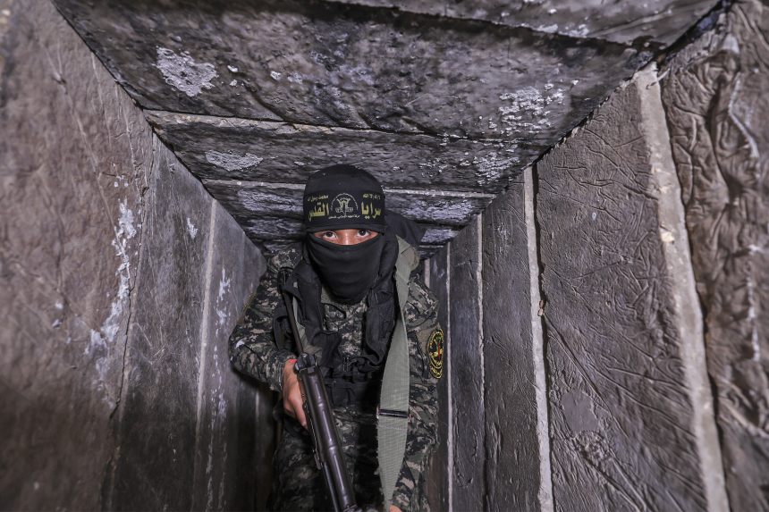 En surface rien n'y paraît. Mais au fond d'une zone boisée, près de Khan Younès, sept hommes masqués, en treillis, munis de mitrailleuses et de lance-roquettes s'engouffrent dans un trou discret, au pied d'une colline sablonneuse, porte d'entrée d'un tunnel secret. Ces combattants des brigades Al-Quds, branche armée du Jihad islamique, principal groupe islamiste armé palestinien après le Hamas, pénètrent un à un dans cette ouverture étroite qui donne sur un tunnel au sol en terre et dont les murs sont couverts de panneaux préfabriqués.