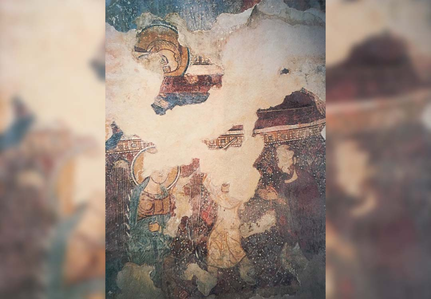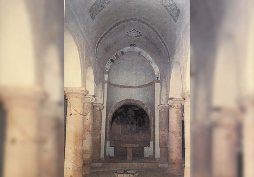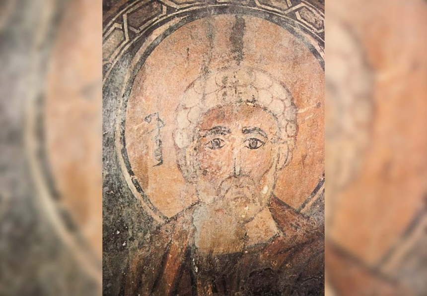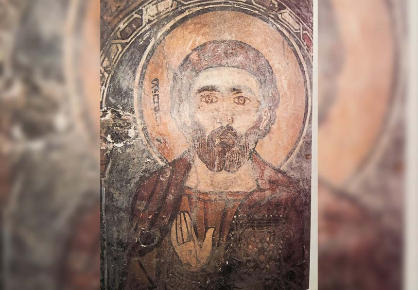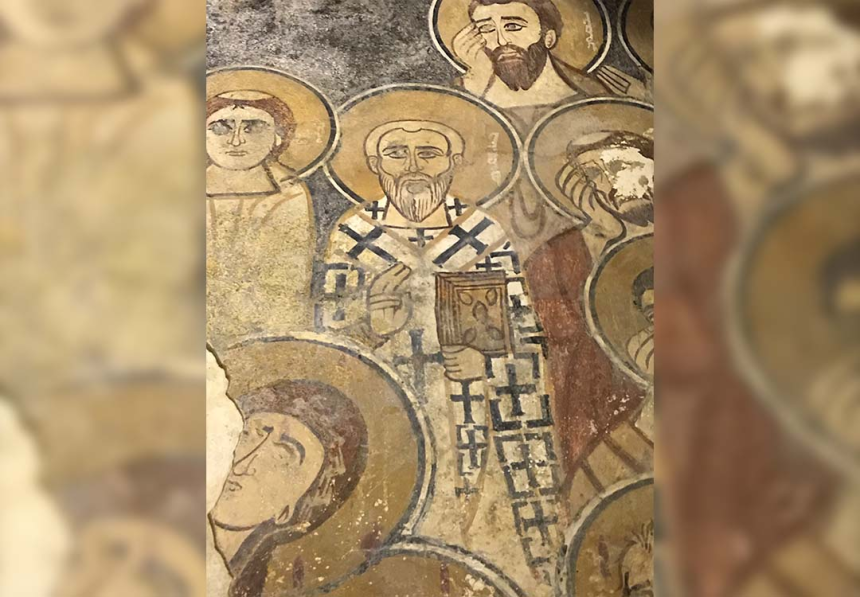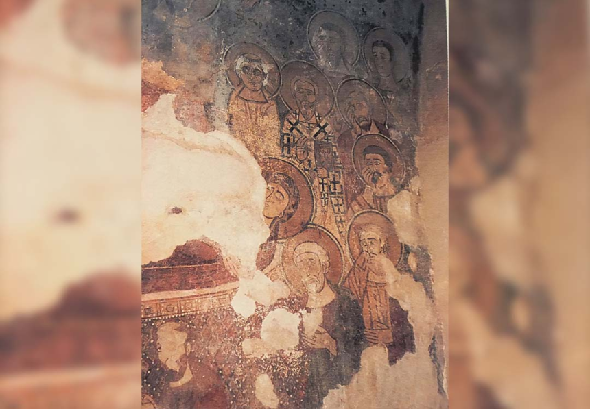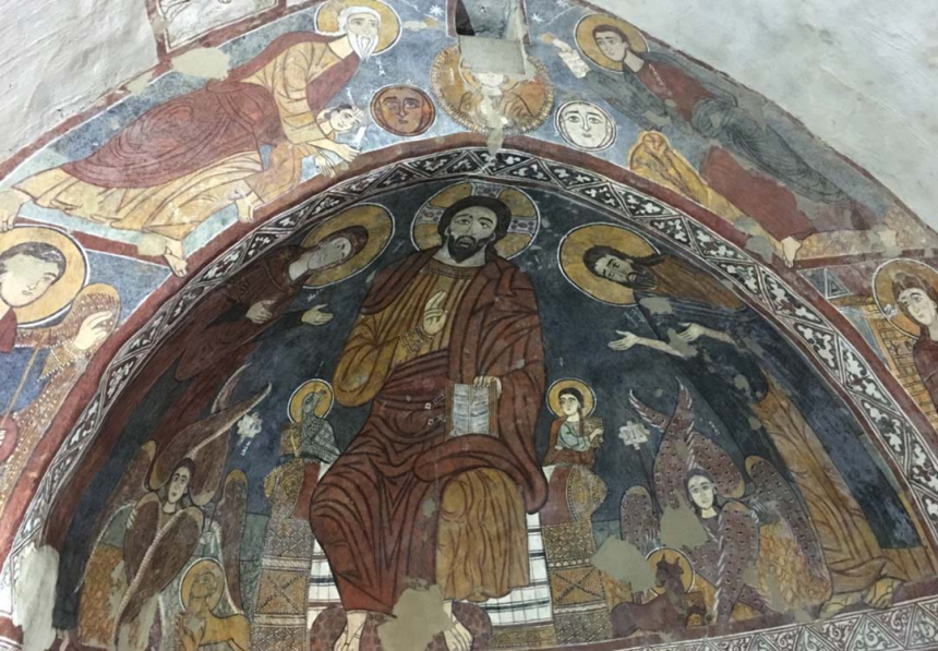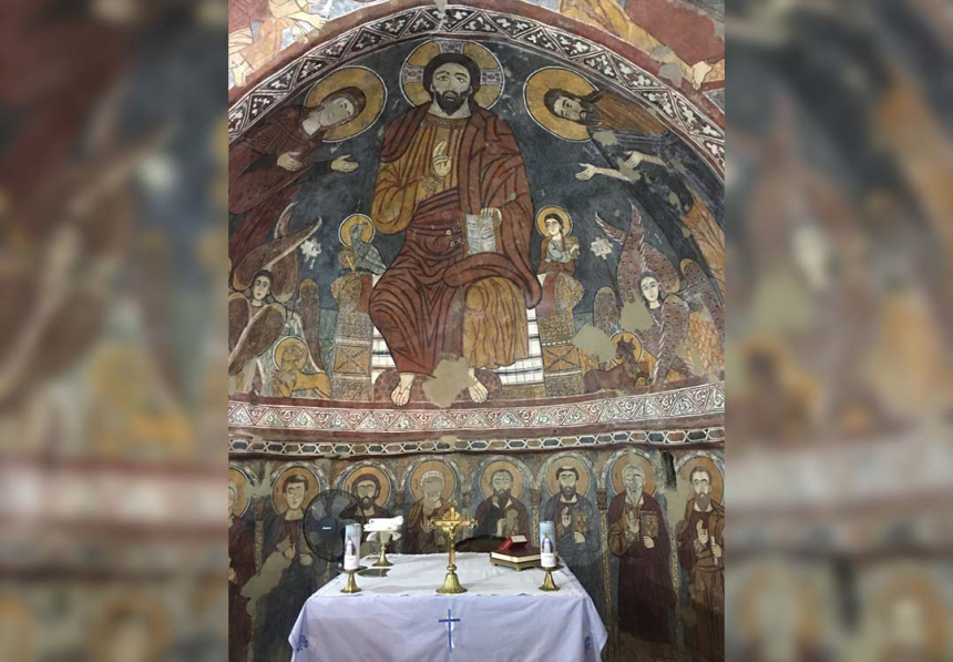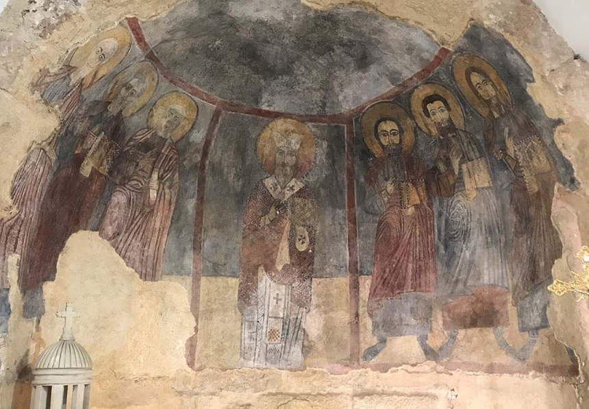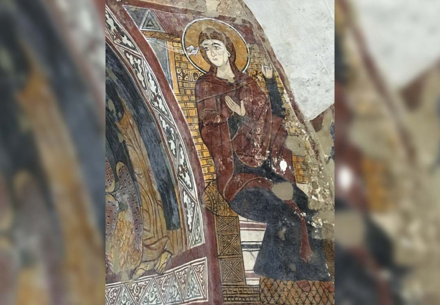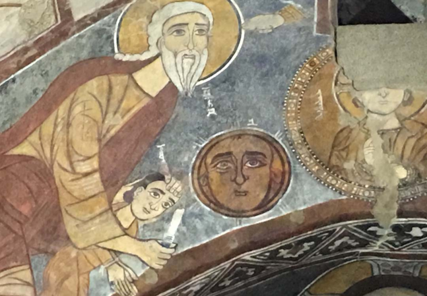 À mi-hauteur de l’arc du cintre, c’est une autre scène avec la Vierge de l’Annonciation à droite et l’archange Gabriel à gauche qui encadrent la conque de l’abside. C’est le thème de l’Annonciation, en très bon état de conservation. Au-dessus, les scènes vétérotestamentaires occupent l’arc triomphal selon une tradition reprise par les manuscrits et les autres fresques d’Orient et d’Occident. On y voit, à droite, la main de Dieu tendant à Moïse les tables de la Loi et, à gauche, la scène du sacrifice d’Abraham avec Isaac et l’agneau de substitution. Nous y lisons: Mouché nviyo (le prophète Moïse), Avrohom, Ishoq.