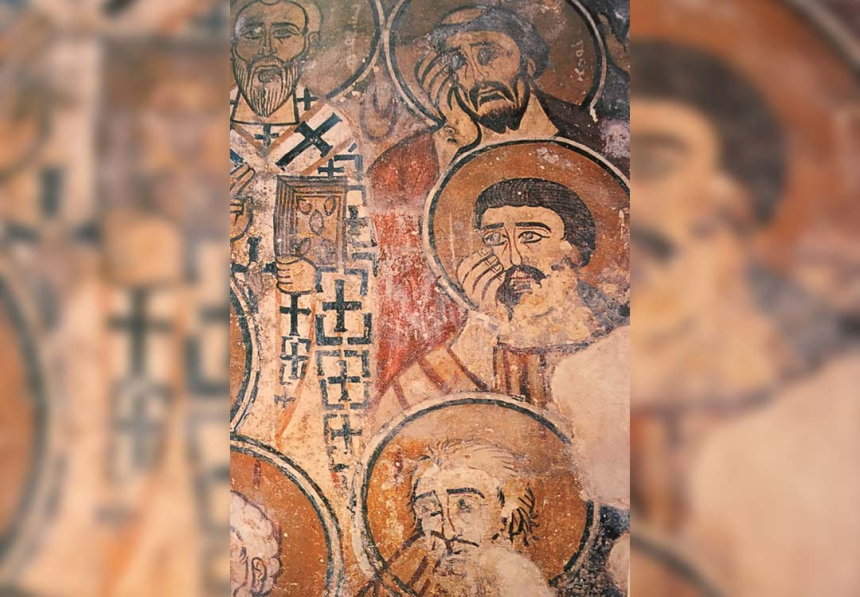 Tout en bas, à la base de la paroi absidale, ce sont les apôtres et évangélistes qui se tiennent droits dans une série d’arcades sur fines colonnes. Chacun est identifié par son nom inscrit verticalement en syriaque dans le nimbe: Pétros, Paolos, Andraos, Philippos, Marcos, Toumo, Mattay, etc. Leurs figures sont stéréotypées, avec les mêmes yeux en amandes, les mêmes traits épais pour les sourcils et les contours des visages. Ils ne se distinguent que par la barbe et la couleur des cheveux.
