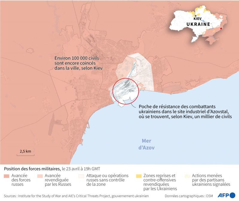 Dans le port stratégique de Marioupol, à la pointe sud du Donbass, presqu'entièrement contrôlé par les Russes mais où sont toujours coincés quelque 100.000 civils selon Kiev, la situation semblait bloquée.