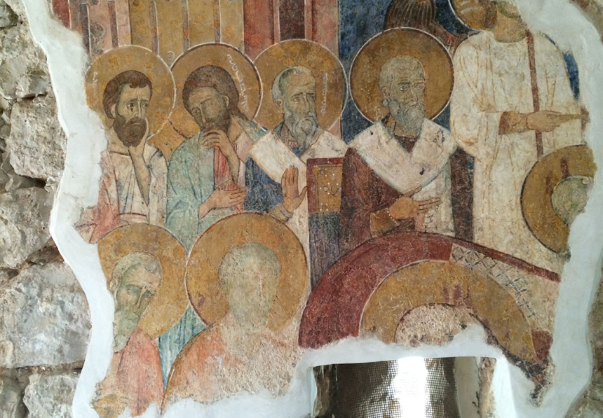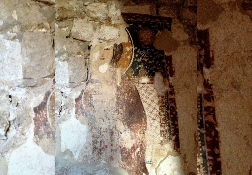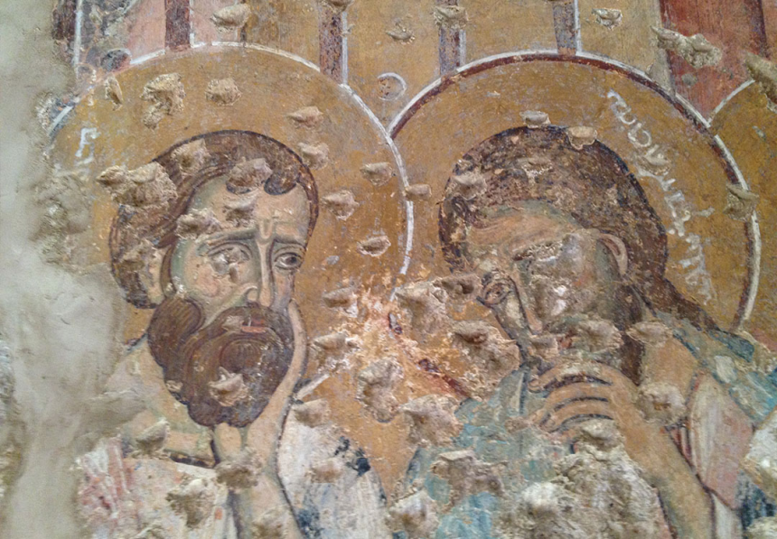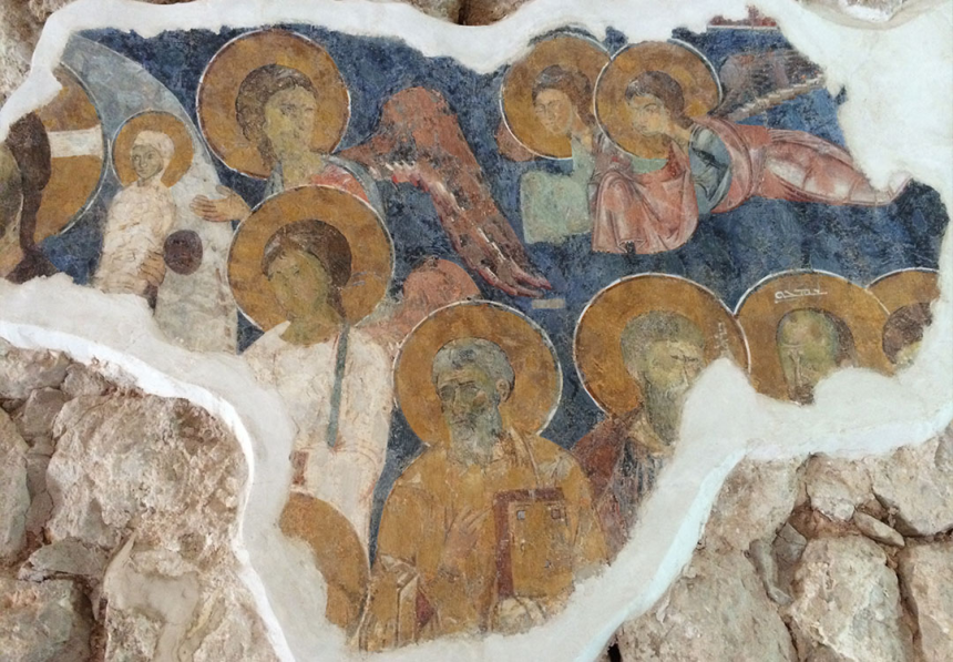 Les nimbes contiennent encore les noms en syriaque vertical, mais les visages sont personnalisés. Ils ne se réduisent plus à un dessin au trait rempli d’aplats monochromes à la manière du premier style observé à Saint-Théodore. Ici, les ombres soulignent les volumes, la lumière et le mouvement. La tristesse se lit dans les regards de Dionysios (Denys) et de Yaacouv (Jacques). Chaque personnage de cette fresque et de la scène voisine de la crucifixion est identifiable par ses traits et non seulement par la couleur des cheveux ou la forme de la barbe. Dans cette même église cependant, la fresque de la Vierge à l’enfant, présente des visages stéréotypés, au trait, avec des remplissages monochromes. Elle est donc d’une autre époque et appartient à la même école que les exemples de Behdidét et de Maad, offrant en cela une juxtaposition des deux styles. Nous relevons également une juxtaposition des deux langues, puisque cette fresque fait appel à des inscriptions grecques.