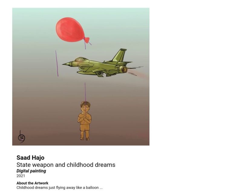 C’est cette triste réalité qu’illustrent les différents artistes de cette exposition virtuelle, soit à travers des reportages photographiques des ruines et de la population qui fuit, soit à travers des interviews et témoignages filmés. Certains témoignages font état d’enlèvement et d’emprisonnement, un sujet qui occupe une salle entière de l’exposition avec des dessins et illustrations tantôt réalistes, tantôt figuratifs et expressifs.