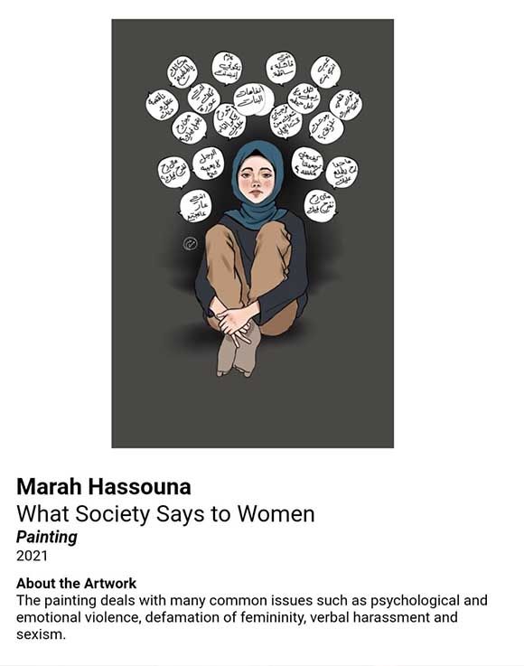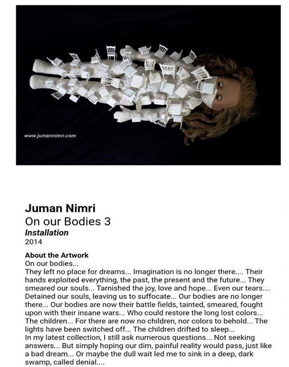 La Jordanie? un pays victime de la corruption de la classe politique, d’injustice, de crimes et de harcèlement. Des portraits de femmes, illustrés ou peints, représentés par un mannequin nu. De même pour les enfants qui sont, eux, représentés par une poupée. Ces choix d’objets représentent le contrôle exercé sur eux par le gouvernement.