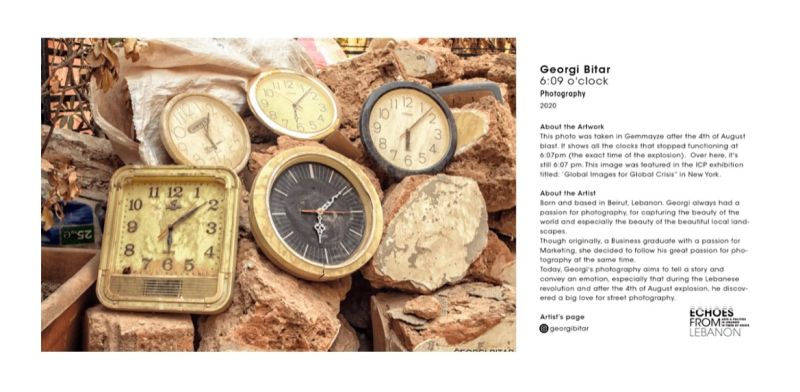 Le visiteur peut apprécier plusieurs types d’œuvres. Certains artistes cherchent uniquement à exposer les faits, sans filtre, tels que les rassemblements d’octobre 2019 ou l’explosion du 4 août et ses retombées, à travers des photographies ou des vidéos à visée journalistique. Parmi cette catégorie d’illustrations, on retrouve des images fortes et symboliques, telles que celles de la longue chaîne humaine qui s’est étalée tout le long du littoral libanais lors du soulèvement d’octobre 2019, ou encore la photographie de montres toutes arrêtées à l’heure de l’explosion du 4 août.