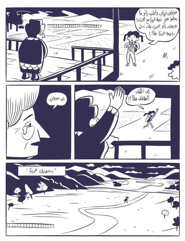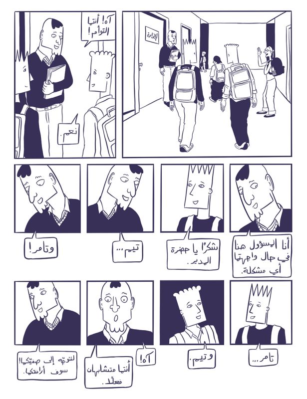 Extrait de Khotta Muhkima de Nour Hiafoui et Ghassan NajaPour finir, Joseph Kaï et Lena Merhej ont tenu à respecter une diversité dans le choix des artistes et des professionnels commissionnés. Certains, tels Walid Taher et Fatima Charafeddine, ont reçu des prix lors de la publication de livres pour enfants. La qualité et la valeur sociale des scénarios ont été garanties par les quatre membres du jury des compétitions. Nathalie Sfeir, Barrack Rima, Ralph Doumit et Maya Fidawi ont tous de l’expérience dans l’édition. La correction de la langue arabe a été assurée par les traductrices Nadine Acoury et Mireille el-Farah, et les relecteurs Randa Kayrouz et Samir Youssef. Joseph Kaï et George Torbey ont réalisé la maquette et tous les visuels de la communication, tandis que Nour Hifaoui et Karen Keyrouz se sont chargées de la diffusion. La sortie d’une version imprimée des BD de la série WatWat est d’ailleurs prévue pour l’année prochaine.