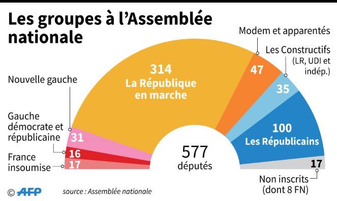 Composition de l'Assemblée nationale sortante. (AFP)La campagne des législatives commence pour de bon : les principaux partis - sauf le RN - se placent samedi en ordre de bataille, à cinq semaines du premier tour.