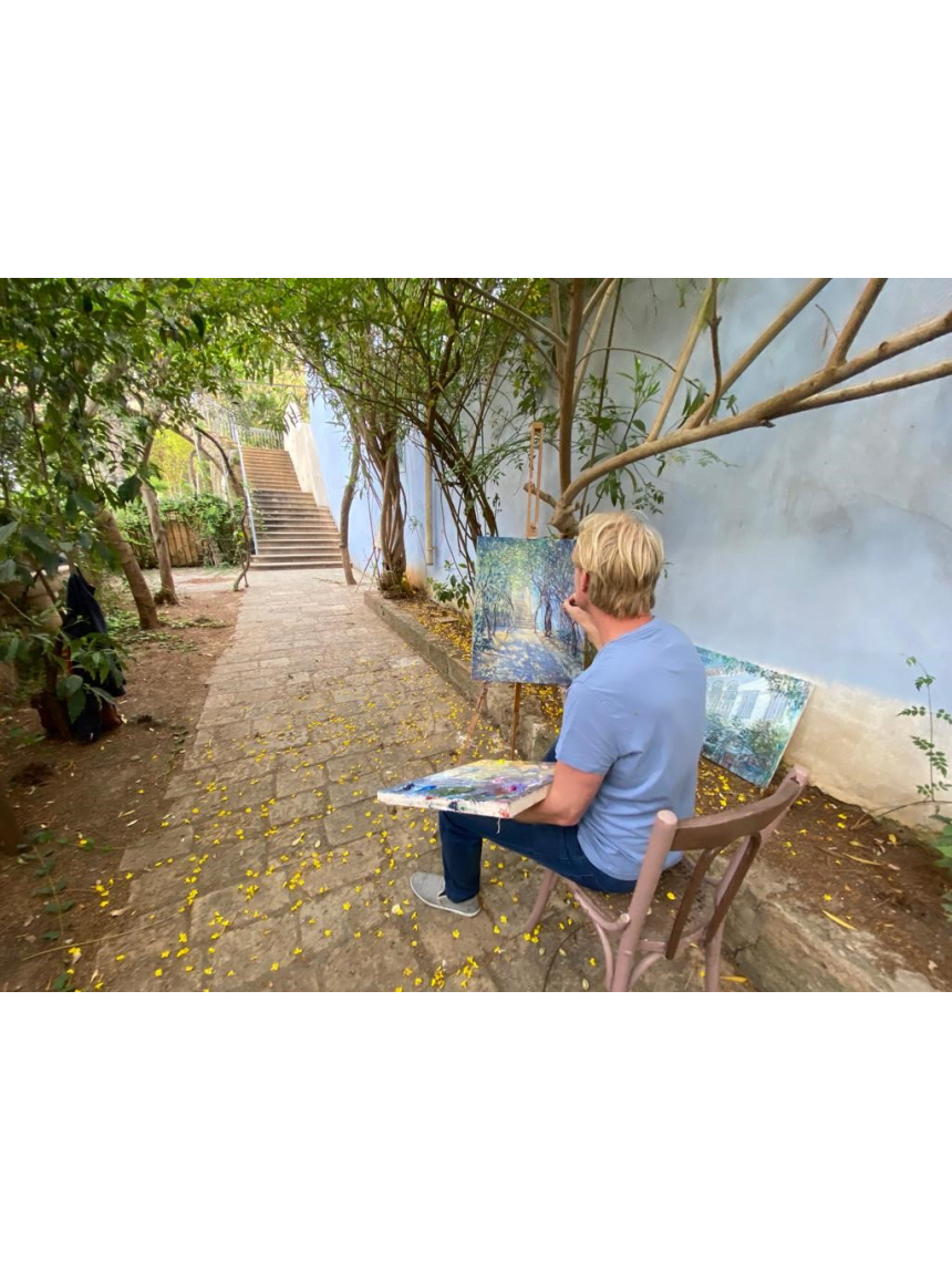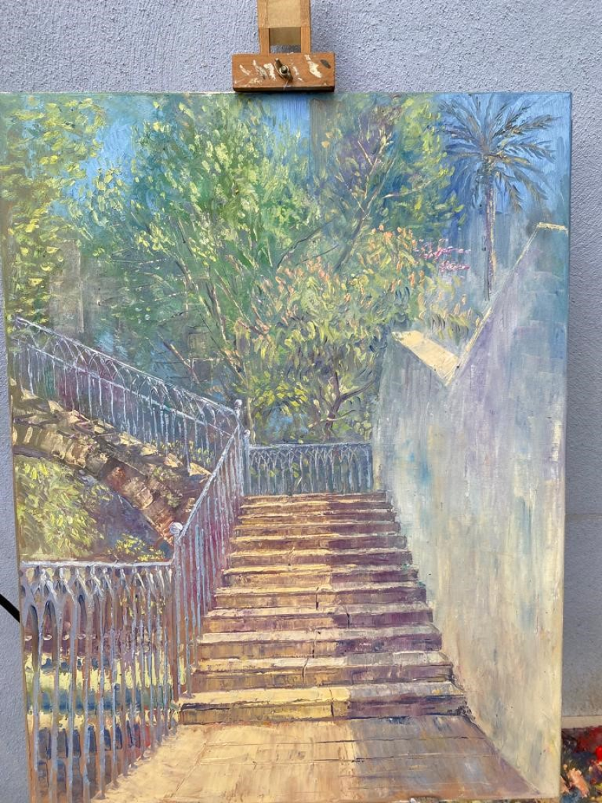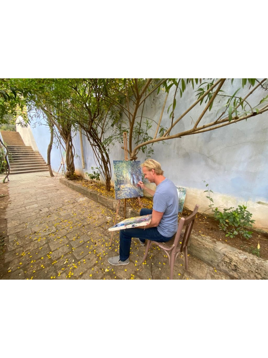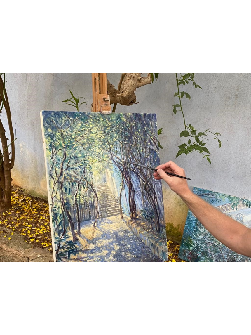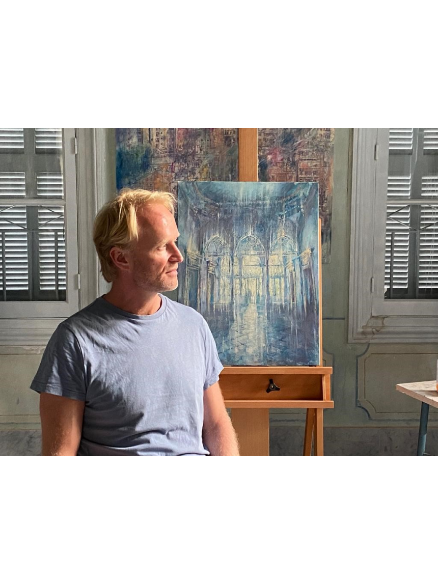 Petit coin d’Eden dans une jungle de béton, la maison est entourée d’un jardin où fleurissent des jacarandas et des jasmins, offrant une nature luxuriante propice à l’inspiration de l’artiste. Ce blond aux yeux bleus est chez lui dans cette ville qui a connu la déchéance et la gloire, sans répit, depuis des millénaires. Il peint les détails du lieu et tente de capturer leur essence. Une montée d’escalier, la façade de la villa, les détails du plafond avec ses dorures baroques, tout est matière à représenter.