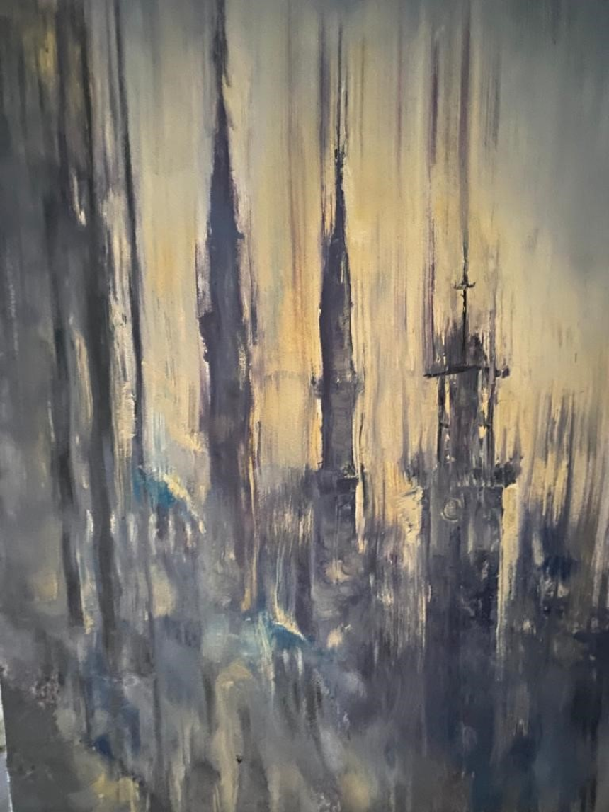 On accède à l’atelier par des escaliers en pierre avec une rampe en fer forgé bleu pastel qui rappelle les murs de cette villa typique libanaise, avec ses trois arcs sur la façade principale et son toit de tuile rouge. Vestige d’un passé révolu, cette mélancolique bâtisse a connu bien des conflits dans ce pays, le dernier étant l’explosion du port de Beyrouth en 2020 qui détruisit la façade et toutes les fenêtres. Young peint le lieu avec des nuances qui évoquent l’effacement et l’éther, le tout teinté d’une mélancolie omniprésente dans ses tableaux.