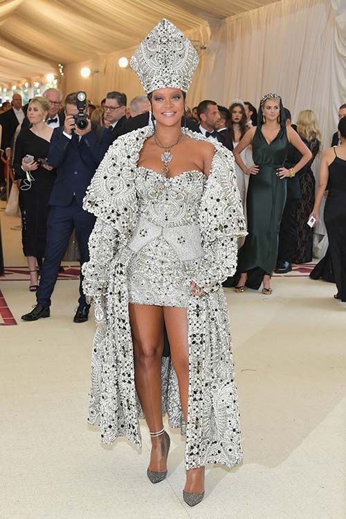 Mais la tenue qui a volé la vedette ce soir-là fut la mini-robe bustier et la tiare pontificale incrustées de perles et de bijoux de Rihanna. Au neuvième siècle, nous avions la légende de la papesse Jeanne, une jeune femme qui aurait fait office de pape pendant plusieurs années, son genre passant inaperçu. En 2018, nous avons Rihanna. L’ensemble, conçu par la Maison Margiela, bien qu’il représentât un chef-d'œuvre en matière de haute couture et d'artisanat, ne fît pas l'unanimité au sein de la communauté chrétienne ; la sexualisation du vêtement religieux ayant été interprétée comme de la dérision.