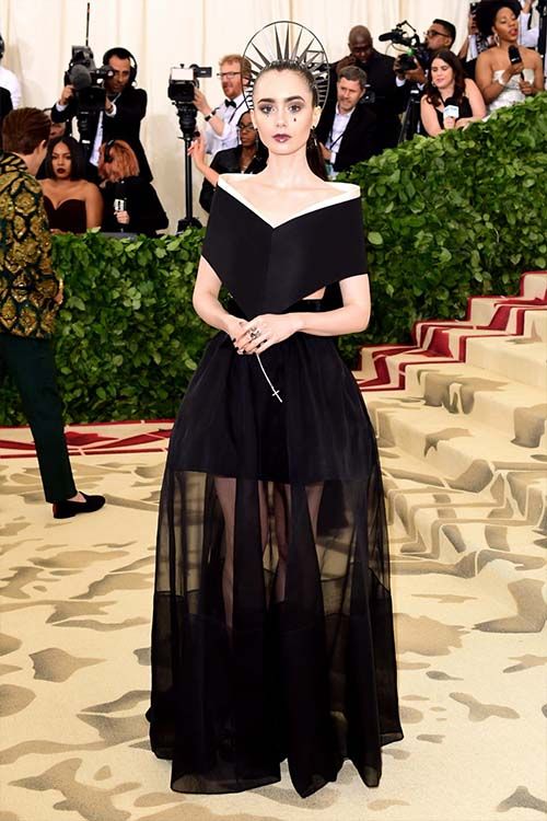 Rihanna, dans un ensemble conçu par la Maison Margiela.Le clin d'œil implicite et prudent de Chanel aux vêtements religieux diffère grandement d’interprétations plus contemporaines. Ce que le Met Gala 2018 a prouvé, c'est que le religieux peut aussi être somptueux et sexy. La mannequin Taylor Hill, habillée en Diane Von Fustenberg, a affiché une réinterprétation de la soutane et de la chape d'un cardinal en portant une robe noire dos nu avec une fente à mi-cuisse et un décolleté plongeant, ceinturée de satin rouge et accessoirisée d'un pendentif en forme de croix. Dans un autre esprit, l’actrice Lilly Collins portait une mini-robe avec un jupon en tulle conçue par Givenchy. La robe s'inspirait de la chasuble des nonnes et était complétée par un halo en argent et un chapelet.