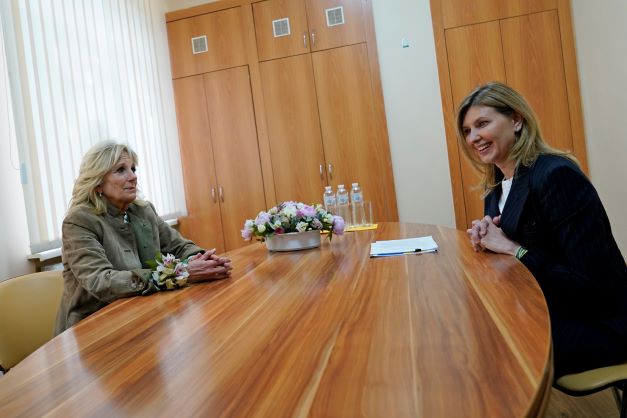 Olena Zelenska recevant Jill Biden lors de sa visite à la frontière ukrainienne le 9 mai dernierMoscou sanctionne 963 personnalités américaines