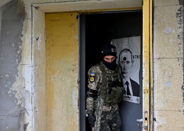 Un militaire ukrainien dans un centre d'entraînement à Kiev, avec Vladimir Poutine en ligne de mire...Il s'est dit de nouveau prêt, éventuellement, à une rencontre "au niveau présidentiel" avec son homologue russe Vladimir Poutine, qui n'a jusqu'à présent jamais donné suite.