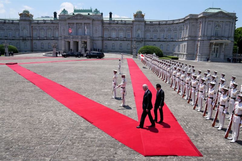 Joe Biden reçu par le Premier ministre japonais Fumio Kishida au Palais d’Akasaka, à Tokyo. (AFP)Le président américain "a affaibli la doctrine d'ambiguïté stratégique et je pense que c'était délibéré", dit-elle, tout en notant qu'il avait malgré tout laissé planer le doute sur la forme exacte que prendrait le soutien américain. "La confusion autour de notre politique sape l'effet de dissuasion", prévient l'experte.