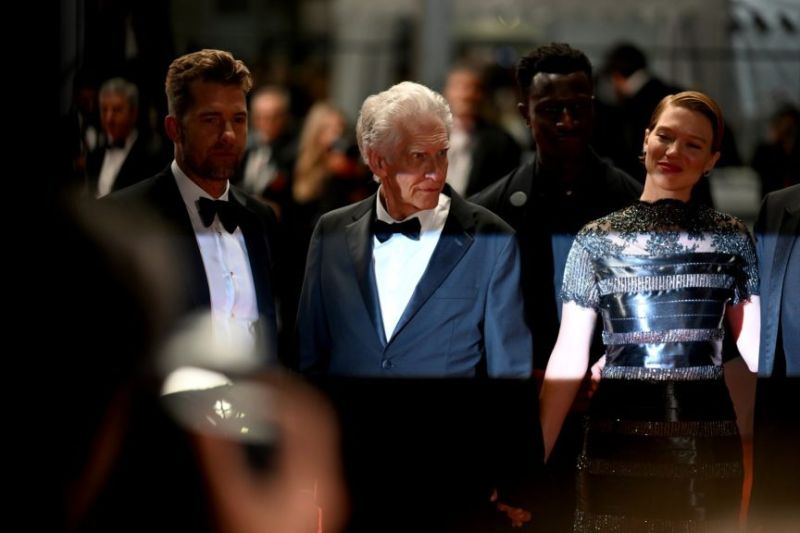 L’acteur canadien Scott Speedman, le réalisateur canadien David Cronenberg, l’acteur luso-guinéen Welket Bungue et l’actrice française Léa Seydoux, après la projection de "Crimes of the Futur"/ AFP
