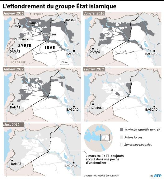 Dans un rapport sur le sujet le secrétaire général de l'ONU Antonio Guterres établit la liste des huit emprises territoriales, en plus des cellules clandestines qu'il a montées en Syrie et en Irak.