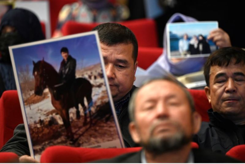 Des militants ouïghours réfugiés en Turquie arborent les portraits de leurs proches du Xinjiang dont ils sont sans nouvelles.Déception ouïghoure