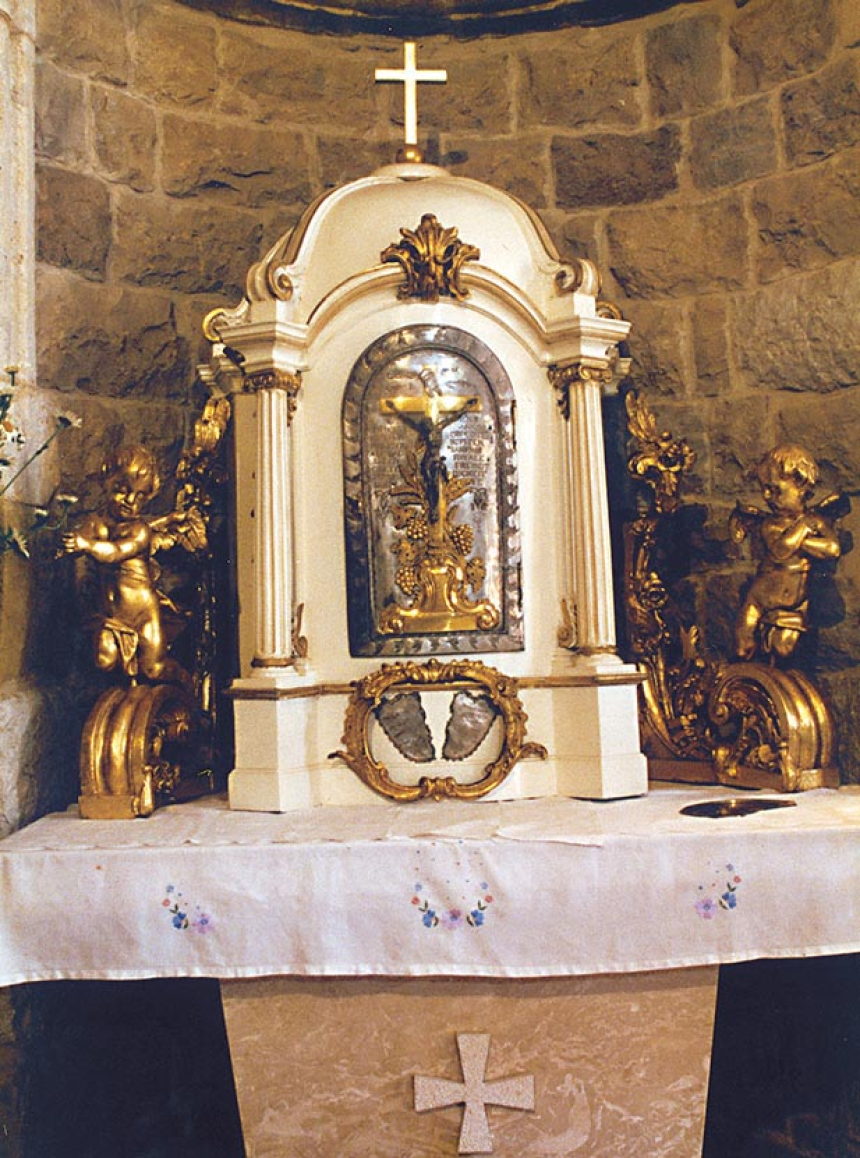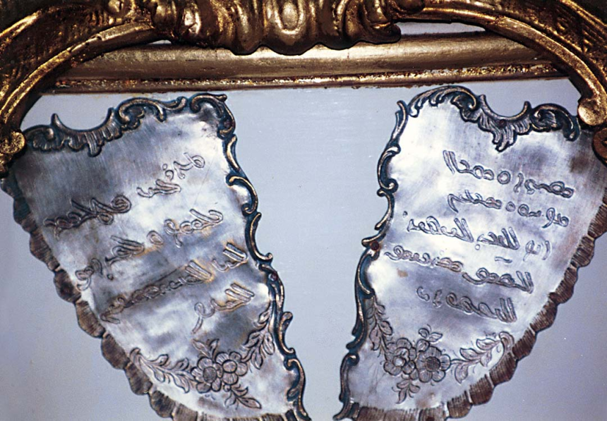 Quant au tabernacle, il a été le fruit d’une étrange rencontre entre le faste baroque de la Contre-Réforme autrichienne et le dépouillement de l’ascétisme syriaque maronite. Flanqué de deux anges dorés, il est composé d’un édicule reposant sur deux colonnes ioniques. Au centre, le crucifix entouré d’inscriptions en caractères latins et syriaques. Et c’est là que la rencontre de ces deux mondes chrétiens est la plus émouvante. Le moine Sarkis n’a pu que tracer ces caractères syriaques sur trois morceaux de papier. Deux inscriptions ont été reproduites sur les plaques d’argent à la base du tabernacle, alors que la troisième orne le tympan surmontant le crucifix.