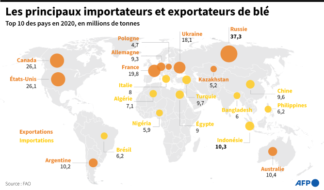 Pour sa part, la Russie, autre puissance céréalière, ne peut pas vendre sa production et ses engrais en raison des sanctions occidentales touchant les secteurs financiers et logistiques. Les deux pays produisent un tiers du blé mondial.