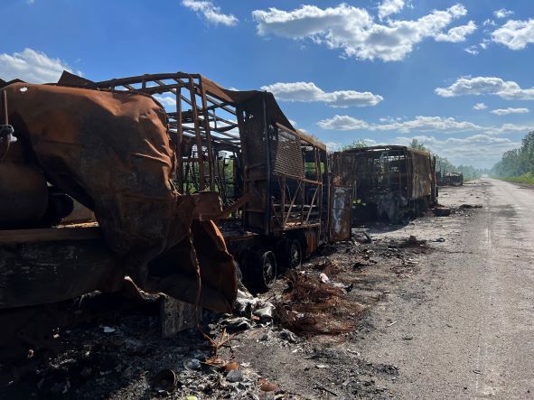 Un convoi de camions détruits par les bombes au Nord du DonbassA Severodonetsk, "les bombardements continuent (...) l'armée (russe) détruit tout simplement la ville", a assuré sur son compte Telegram le gouverneur de la région de Lougansk, Serguiï Gaïdaï. Selon lui, l'armée russe est entrée dans les faubourgs de la ville où elle a subi "de lourdes pertes", tandis que les forces ukrainiennes tentaient de déloger les Russes d'un hôtel.