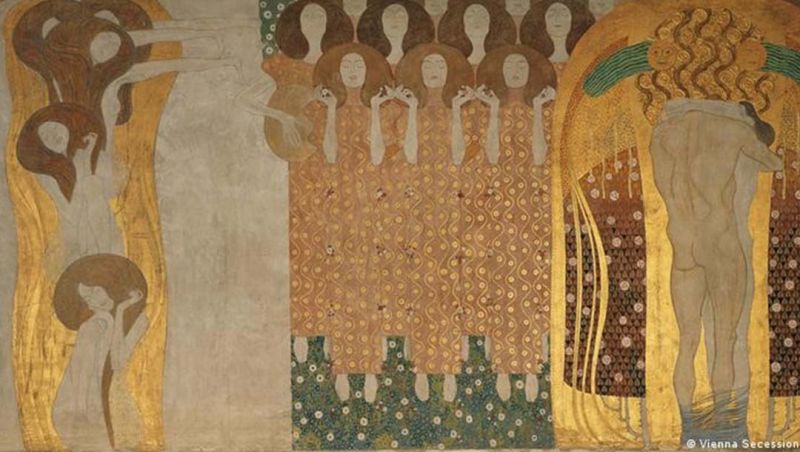 À l’occasion de la quatorzième exposition de la Sécession, en 1902, Klimt crée l’une de ses œuvres les plus célèbres: La Frise Beethoven. C’est une symphonie ornementale longue de trente-quatre mètres et haute de deux mètres, où Klimt réalise l’Hymne à la Joie de Beethoven, en utilisant divers matériaux. Il s’inspire de l’art gothique et utilise l’or à profusion.