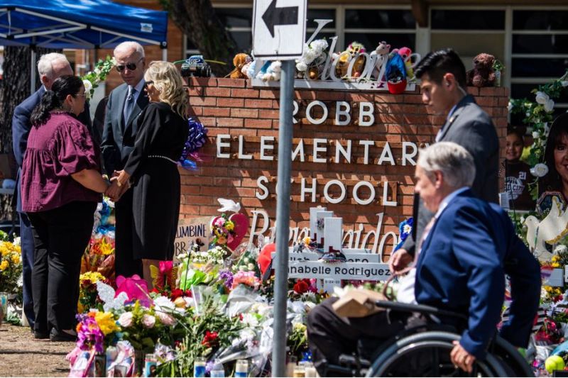 Le couple présidentiel s'est rendu à l'école primaire Robb, dont le nom est désormais synonyme de l'un des pires massacres en milieu scolaire aux États-Unis. Joe et Jill Biden se sont recueillis et ont déposé un bouquet devant des croix portant les noms des victimes, presque submergées de fleurs, avec çà et là une peluche. Puis le couple, visages douloureux derrière leurs lunettes noires, a passé en revue une rangée de grandes photos montrant les bouilles des enfants fauchés, âgés d'entre 9 et 11 ans.