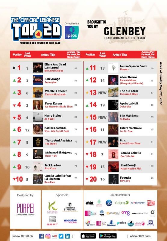 Cette semaine dans OLT20, toutes les félicitations à la chanteuse libanaise Elissa qui revient avec un nouveau duo aux côtés du chanteur marocain Saad Lamjarred avec Min awel dekika, officiellement sur le marché depuis le 4 mai. Depuis, et en moins de 4 semaines, elle a réussi à avoir près de 100 millions de vues sur YouTube et à être en première place dans le Golfe et en Afrique du nord. Réussira-elle la passe de 3? Reponse la semaine prochaine!