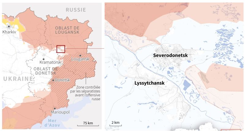 "Si dans deux-trois jours, les Russes prennent le contrôle de Severodonetsk, ils vont y installer de l'artillerie et des mortiers et vont bombarder de façon plus intense Lyssytchansk", la ville voisine située de l'autre côté de la rivière Donets, selon M. Gaïdaï, qui estime cette localité plus difficile à prendre car "située sur des hauteurs".