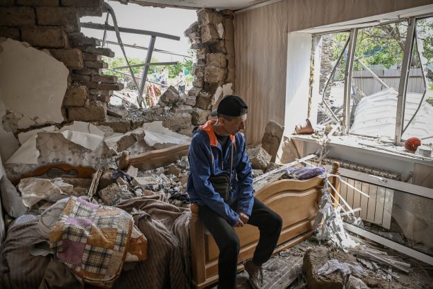 A Sloviansk, dans le Donbass, cet homme est atterré de voir sa demeure détruite par les bombes.Annexions en série