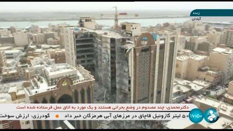 Des images de l'édifice avant son effondrement, ici diffusées à la télévision d'État iranienne."Abadan", nouveau slogan