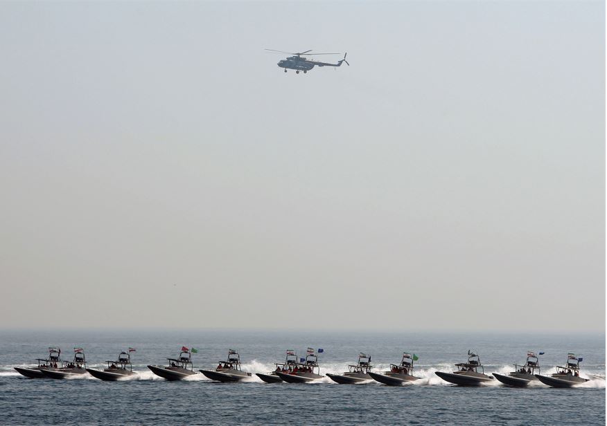 Un hélicoptère militaire iranien survole les canots rapides des Gardiens de la révolution lors d'exercices navals dans le Golfe, en 2010.Absence de "réponses satisfaisantes"