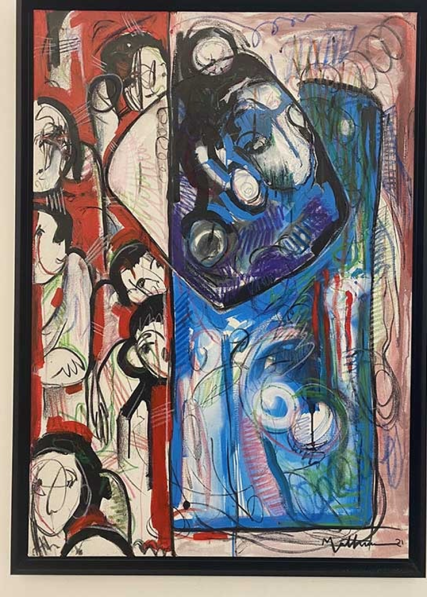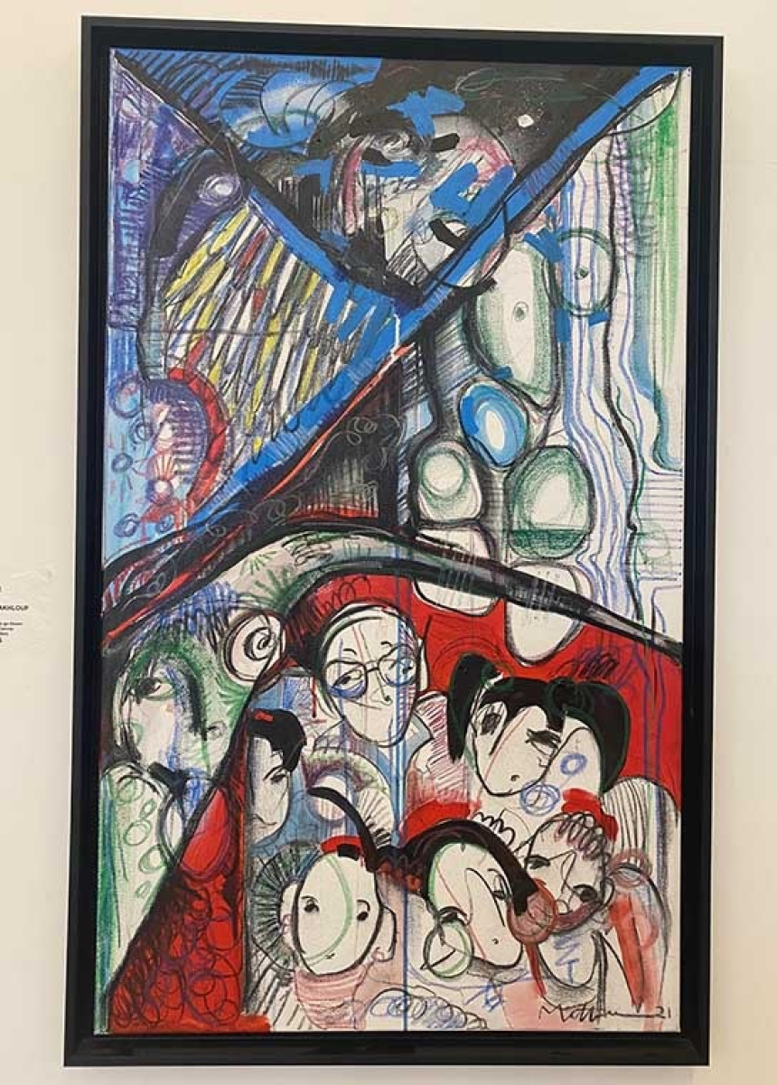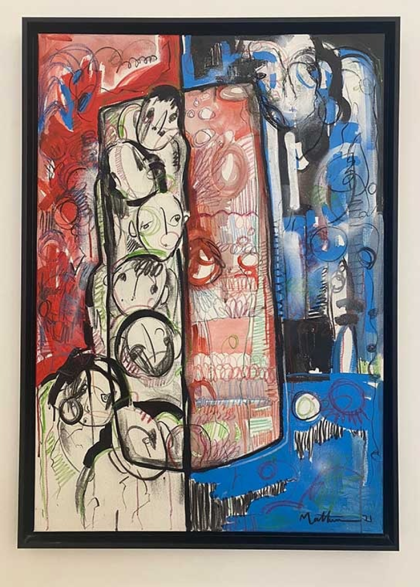 Les enfants se cachent des adultes pour mieux voir le monde et vivre avec joie et insouciance. Mathieu Makhlouf écrit ceci sur des toiles où le rouge et le bleu prédominent, encadrant des silhouettes cernées souvent en noir, aux pastels à l'huile.