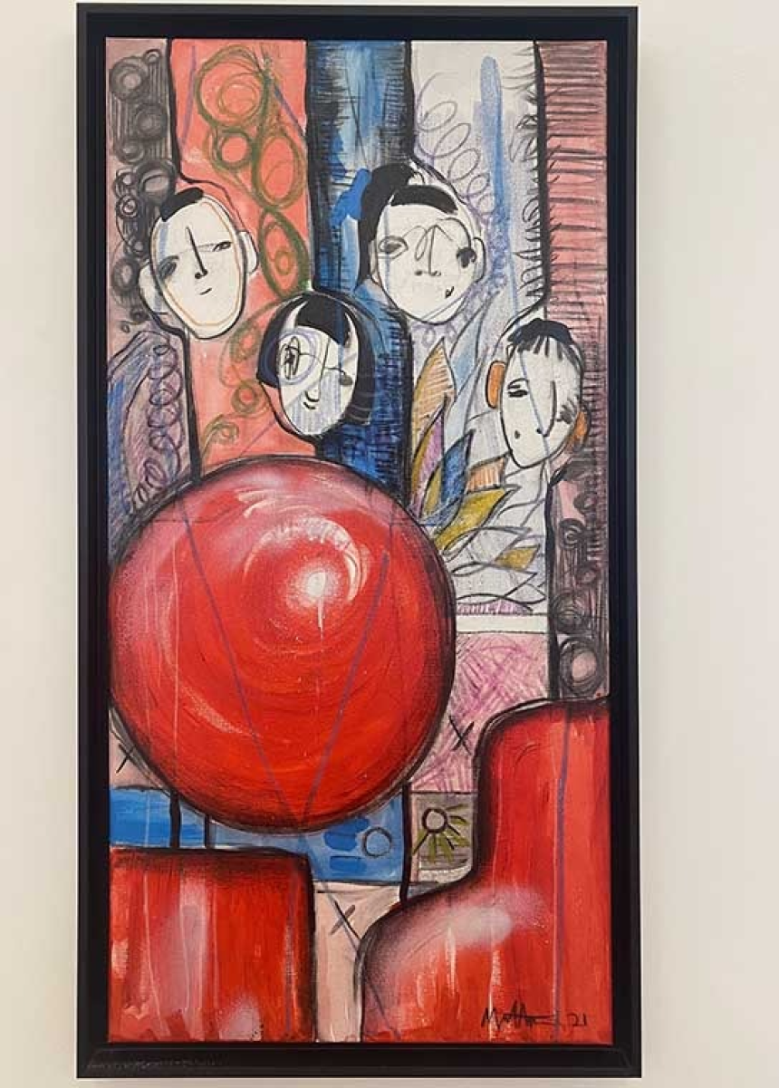 En visitant son exposition, on est projeté, au gré d’une trentaine de peintures et de dessins conçus avec des médias mixtes, dans l’univers de l’artiste. Il s’agit d’une histoire qu’on lit de toile en toile. On découvre le monde imaginaire de l’enfance auquel les adultes ne comprennent pas vraiment grand-chose.