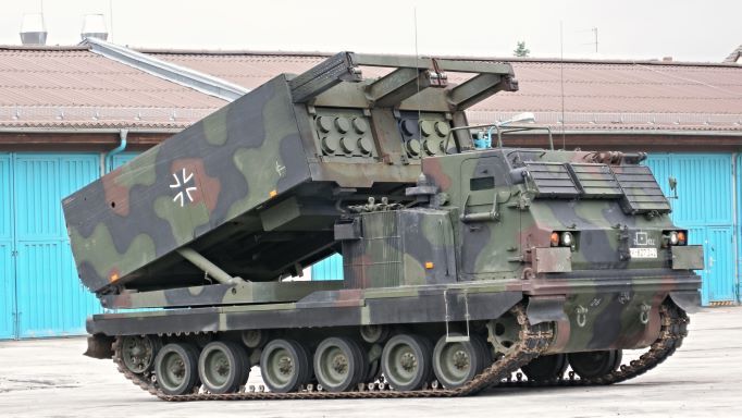 Un M270 MLRS de la Bundeswehr, l'armée allemande. Ce système, également américain, est une version antérieure au Himars.