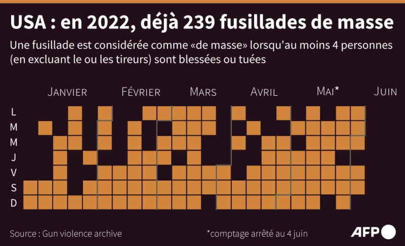 Le pays est marqué par une flambée de violences par armes à feu, en particulier la tuerie dans une école au Texas le 24 mai (19 enfants et deux enseignantes tués). Depuis, plus d'une vingtaine de fusillades ont eu lieu, selon l'association Gun Violence Archive.