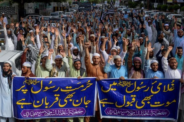 ©Des partisans du parti islamique et politique pakistanais Jamiat Ulema Islam-Fazal (JUI-F) crient des slogans anti-indiens contre les propos sur le prophète Mahomet tenus par un responsable du parti au pouvoir en Inde, lors d'une manifestation à Karachi le 6 juin 2022. (AFP)