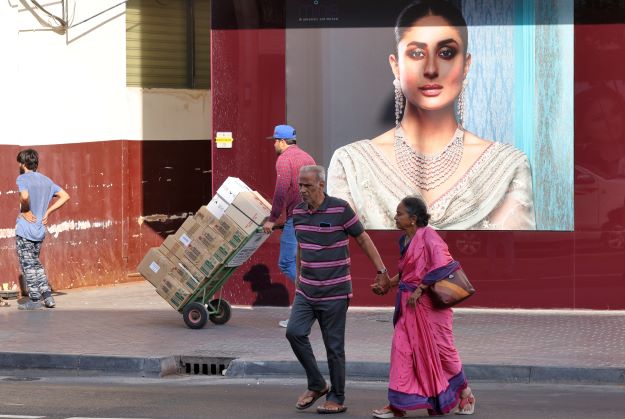 Des gens passent devant une publicité mettant en vedette l'actrice indienne Kareena Kapoor sur un marché de l'or à Dubaï, le 6 juin 2022. Les pays du Golfe ont condamné les remarques sur le prophète Mahomet faites par un haut responsable du parti au pouvoir indien qui ont été qualifiées d'"islamophobes". (AFP)