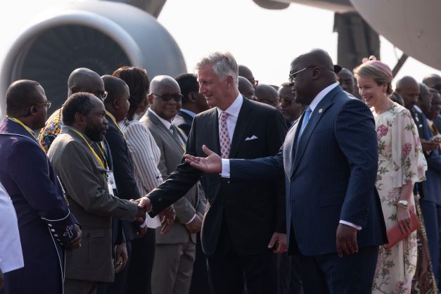 Le souverain belge, la reine Mathilde et la délégation gouvernementale qui les accompagne ont été accueillis à l'aéroport international de N'Djili, à la périphérie de la capitale, par le président congolais Félix Tshisekedi et son épouse Denise. (AFP)Le roi des Belges Philippe est arrivé mardi après-midi à Kinshasa pour sa première visite officielle en République démocratique du Congo (RDC), sur fond de travail de mémoire et de réconciliation entre la Belgique et son ancienne colonie.