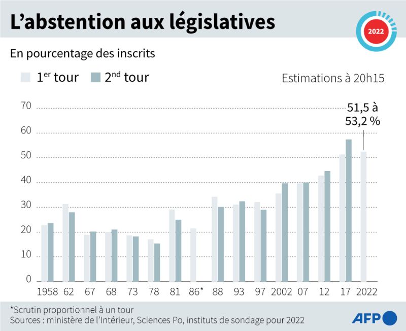 La gauche unie et le camp Macron sont au coude-à-coude dimanche au premier tour des élections législatives, (25% à 25,9%), le président réélu n'étant pas assuré de conserver la majorité absolue à l'Assemblée nationale, sur fond d'abstention record.
