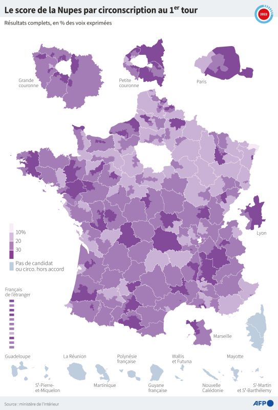 Les résultats des élections législatives laissent promettre un second tour serré, principalement entre le parti Renaissance! du camp présidentiel, et la Nouvelle Union Populaire, Ecologique et Sociale (NUPES) qui rassemble plusieurs partis de gauche. Selon les derniers chiffres, les deux camps seraient au coude-à-coude et s'affronteront dans la plupart des circonscriptions, tandis que l'extrême-droite, elle, enregistre un score comparable à celui de la présidentielle au premier tour, mais échoue à se qualifier pour le second tour, se contentant d'une troisième place.