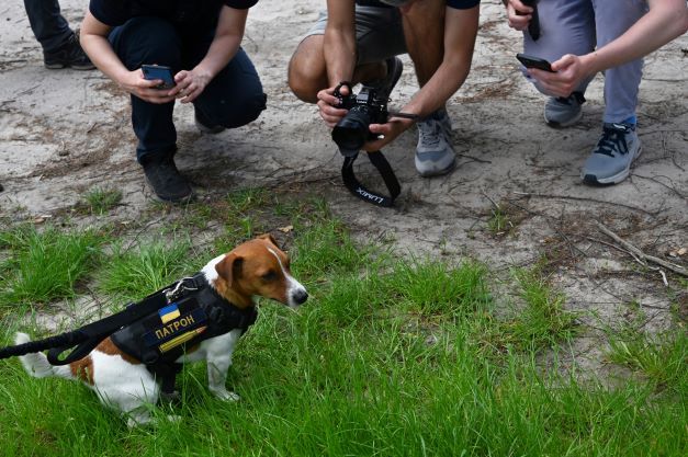 "Patron" est un héros de guerre. Ce Jack Russell Terrier est renifleur de mines terrestres. Il est assailli par les photographes après son retour d'un travail de déminage dans un village de la région de Tchernihiv. (AFP)