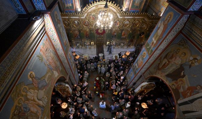 Les funérailles d'un membre des forces armées ukrainiennes en la cathédrale de Lviv.